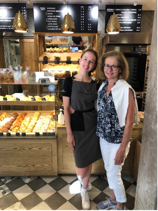 At the café, Crustum, I am now the recipient of welcoming smiles from the young woman who makes my morning cup of green tea (zalioji arbata) with steamed milk (karsto pieno). Gabija speaks English well and has taught me my first words in Lithuanian: labas rytas (good morning), and aciu (thank you). She is educated at the university level and is now taking Spanish language classes as well, knowing the value of speaking more than one idiom. She is efficient in the bakery, managing customers while also doing much of the baking. A gentle melodic tone alerts her to remove something from the oven! (see photos below).