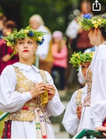 Each night of this past week, there have been festivals of music and dance in the parks and on the hillsides around Vilnius. Many of the women and men dress in costume and/or wear rings of woven greenery and flowers in their hair. The women wear loose-fitting linen dresses, shifts, with flowers in their hair and around their necks, and the few men in costume wear what I would call linen britches, that clasp around the leg, just below the knee. The children dressed in modern-day t-shirts, shorts, and tennis shoes, also sport flower rings on their heads, and I see them also in the morning, traipsing with their mothers or fathers, apparently off to camp or other school activities, carrying a backpack and a ring of flowers in their hands for the day.